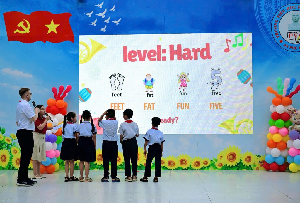 Nổi bật trong chương trình là trò chơi Say Word on the Beat, nơi các bạn nhỏ nhanh tay, nhanh trí nói từ tiếng Anh theo nhịp, tạo nên bầu không khí vui nhộn và đầy tiếng cười. Bên cạnh đó, trò Ném vòng săn quà cũng thu hút đông đảo học sinh tham gia khi các bạn vừa thử thách sự khéo léo, vừa trả lời câu hỏi để nhận những phần quà đáng yêu từ Ban Tổ chức. Không kém phần sôi nổi, Cuộc đua kỳ thú mang đến tinh thần đồng đội và sự hào hứng khi các bạn cùng nhau vượt qua các chặng thử thách đầy hấp dẫn.